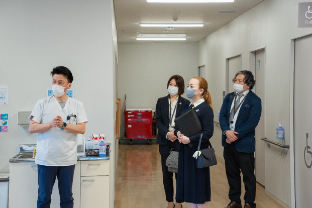 23日(土)「キラメキテラスヘルスケアホスピタル」をご視察の際には、リハビリテーション室を訪れました。6歳の女児がコミューンを使って発音の練習をしている姿を見守り、スタッフの説明を熱心にお聞きになりました。